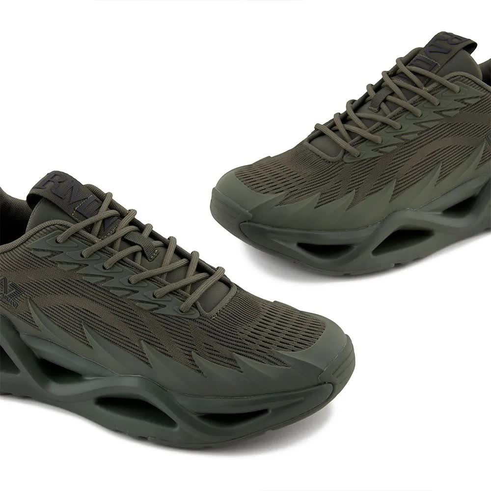 Destacam-se pela cor preta profunda e pela silhueta dinâmica de cano baixo com bico arredondado. O solado maciço e esculpido com aberturas futuristas e padrão geométrico é um diferencial, conferindo ao calçado um caráter verdadeiramente único.